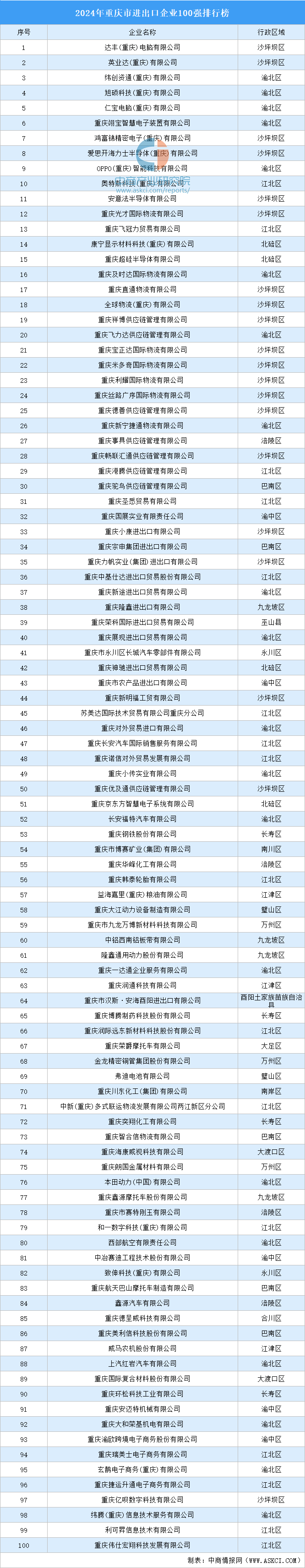中商谍报网讯:3月13日,进出口商会2024年度会员大会暨“稳增量、进出口企业100强榜单揭晓,达丰电脑无限公司等100家企业上榜。渝北区、江北区16家企业上榜,渝中区、巴南区各5家企业上榜。