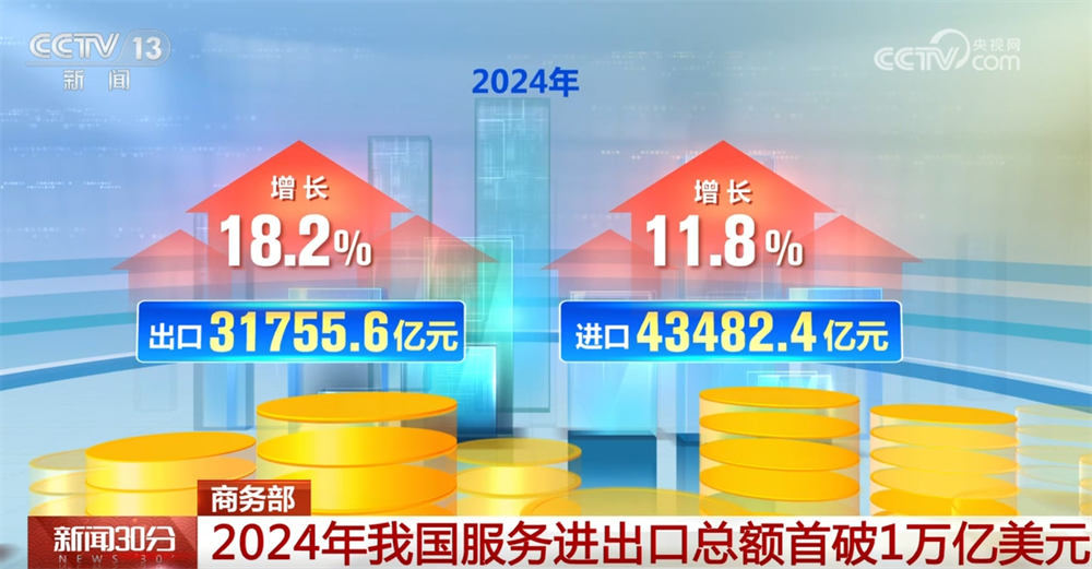 商务部数据显示,2024年,全年办事进出口总额初次冲破1万亿美元,规模创下汗青新高,布局持续优化,展示出广漠的成长潜力。2024年,中国全年办事进出口总额75238亿元,同比增加14。4%。此中,出口31755。6亿元,增加18。2%;进口43482。4亿元,增加11。8%;办事商业逆差11726。8亿元,比上年削减314。3亿元。
