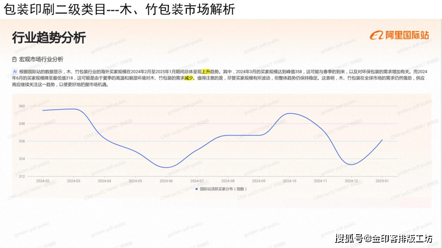 按照国际坐的数据显示,竹包拆行业的海外买家规模正在2024年2月至2025年1月期间总体早现上升趋向,此中,2024年3月的买家规模达到峰值358,这可能取春季的到来,以及对环保包拆的需求添加相关,而2024年6月的买家规模降至最低值318,这可能是因为夏日的高暖和湖温对木、竹包拆的需求削减。值得留意的是,虽然买家规模有所波动,但全体趋向仍连结不变,这表白,木、竹包拆正在全球市场的需求仍然强动,供应商应继续关心这一趋向,以便更好地把握市场机缘。