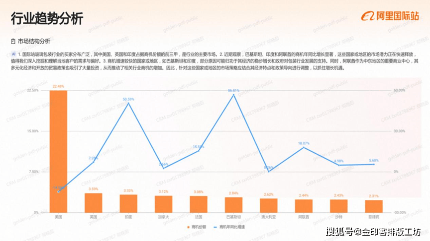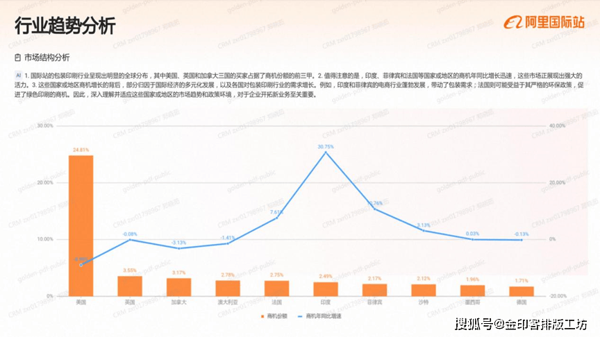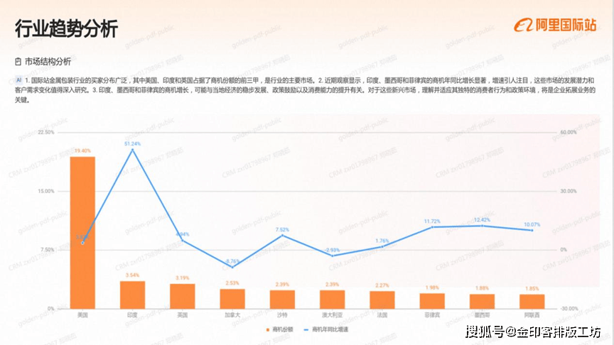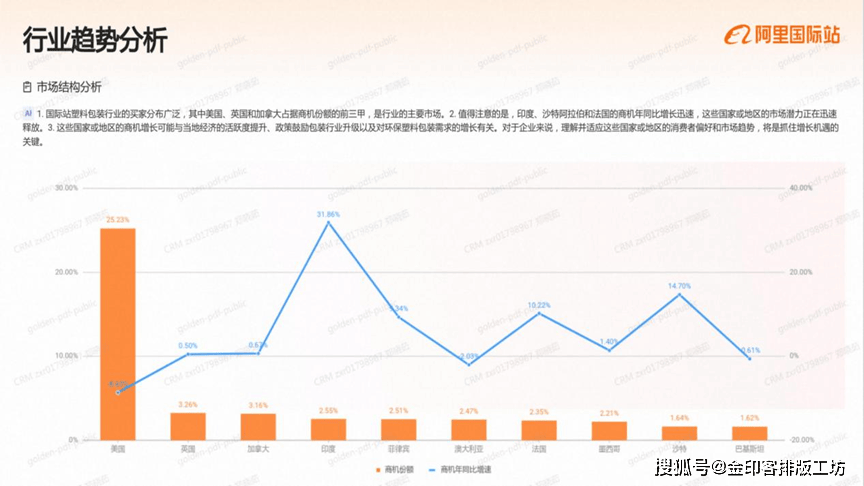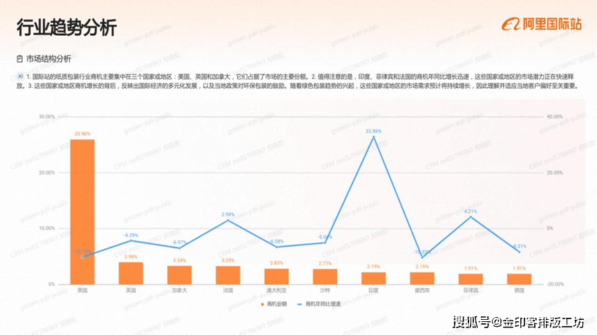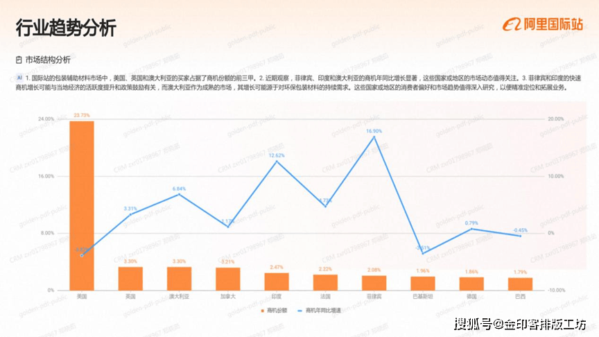 国际坐的印刷办事市场中,美国、加金大和占报商机份颖的前三用,是行业的次要买家来历、2,结得留意的是,埃襄佛比亚、菲律定和法国的商机年同出旗长识读。这些国度或地域的市场港力不容级视。3这些国度或地域商机增加的背后,可能取本地经济的活跃磨提拔、政策支撑以及对印刷办事票求的增加相关、例如,埃察佛比亚和菲律宾的制浩业成长,可能带动了对的刷包拆办事的票求、而法国则可能因为国内消典市场的苏醒,使得印刷办事需求响应添加。因而,深切理解这些国度或地域的市场动态和客户偏好,对于企业开辟新市场至关主要。阿里巴巴国际坐)成立于1999年,是阿里巴巴集团的第一个营业,现已成为全球B2B数字商业平台,笼盖全球190多个国度和地域,为数以万万计的全球中小企业供给一坐式数字商业处理方案阿里巴巴国际坐不竭摸索并实施数字化和智能化计谋,将最新的生成式AI手艺取外贸行业各个环节连系于2023年率先推出AI生意帮手、OKKIAI等AI外贸使用,为生意运营降低门槛,为生意结果提质增效。同时依托25年来堆集的外贸能力,深度整合跨境供应链,于2024年推出业内首个B2B半托管办事,为中小企业供给更多更简单的出海体例。