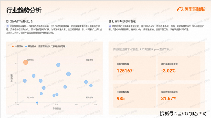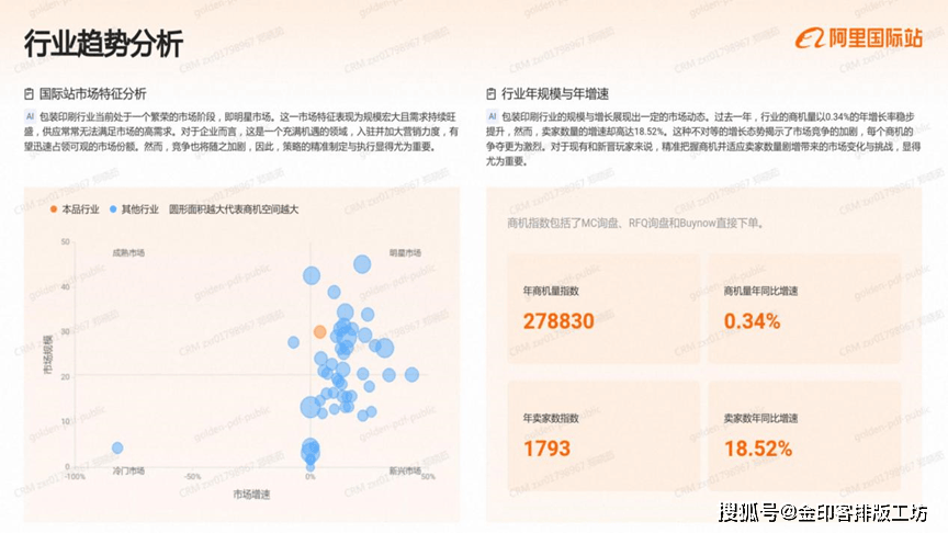 包拆印刷行业当前处于一个繁荣的市场阶段,即明星市场。这一市场特征表示为规模弘大且需求持续兴旺,对于企业而言,这是一个充满机缘的范畴,入驻并加大营销力度,无望敏捷占领可不雅的市场份额。然而,合作也将随之加剧,因而,策略的精准制定取施行显得尤为主要。包拆印刷行业的规模取增加展示出必然的市场动态。过去一年,行业的商机量以0。34%的年增加率稳步提拔,然而,卖家数量的增速却高达18。52%。这种不合错误等的增加态势了市场所作的加剧,每个商机的抢夺更为激烈。对于现有和新晋玩家来说,精准把握商机并顺应卖家数量剧增带来的市场变化取挑和,显得尤为主要。