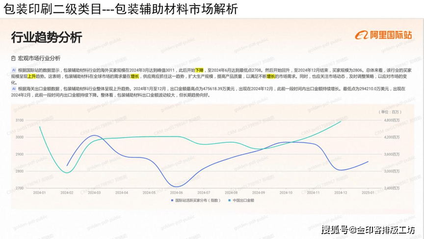 按照国际坐的数据显示,包拆辅帮材料行业的海外买家规模正在2024年3月达到峰值301,此后起头下降,至2024年6月达到最低点2708,然后起头回升,至2024年12月竣事,买家规模为2806,总体来看,该行业的买家规模呈现上开趋向,这表白,包拆辅帮材料正在全球市场的需求量正在增加,供应商应抓住这一趋向,扩大出产规模,提高产质量量,以满脚不竭增加的市场需求,同时,也应关心市场动态,及时调整策略,以应对市场的变化。按照海关出口金额数据,包拆辅帮材料行业全体呈现上升趋向,2024年1月至12月,出口金额最高点为475618。39万美元,呈现正在2024年12月,此前一段时间内出口金额持续增加。最低点为294210。0万美元,呈现正在2024年2月,此前一段时间内出口金额持续下降。全体看,包拆辅帮材料出口金额波动较大,但持久趋向向好。