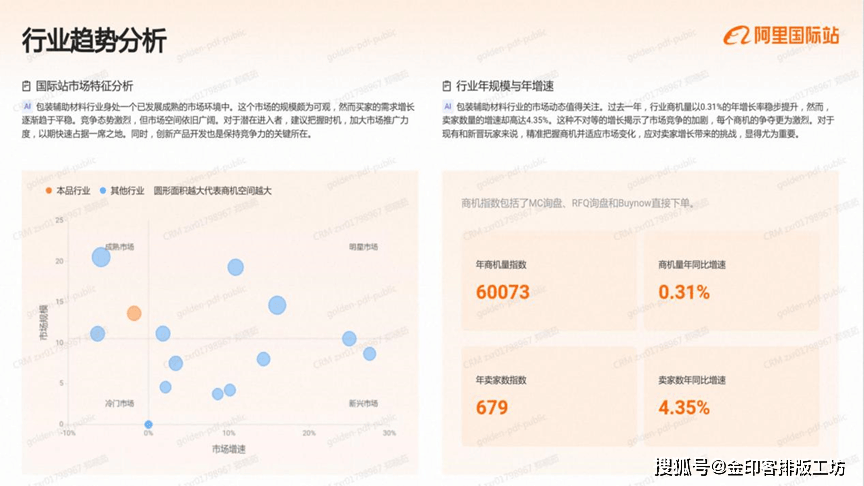 包拆辅帮材料行业身处一个已成长成熟的市场中。这个市场的规模颇为可不雅,然而买家的需求增加逐步趋于平稳。合作态势激烈,但市场空间照旧广漠。对于潜正在进入者,把握机会,加大市场推广力度,以期快速占领一席之地。同时,立异产物开辟也是连结合作力的环节所正在。包拆辅帮材料行业的市场动态值得关心,过去一年,行业商机量以0。31%的年增加率稳步提拔,然而卖家数量的增速却高达4。35%。这种不合错误等的增加了市场所作的加剧,每个商机的抢夺更为激烈。对于现有和新晋玩家来说,精准把握商机并顺应市场变化,应对卖家增加带来的挑和,显得尤为主要。