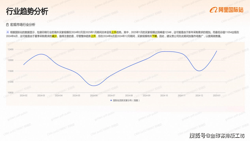 按照国际坐的效据显示,包拆印刷行业的海外买家规模正在2024年2月至2025年1月期间总体呈现上升趋向,此中,2025年1月的买家规模达到峰值12348,这可能是因为新年采购需求的添加,而最低谷值11054呈现正在2024年6月,这可能是因为夏日采购需求的削减,值得留意的是,虽然全体趋向上升,但正在2024年6月至2024年12月期间,买家规模有所下降,因而,贵公司正在此期间加强市场推广,以提高发卖量。