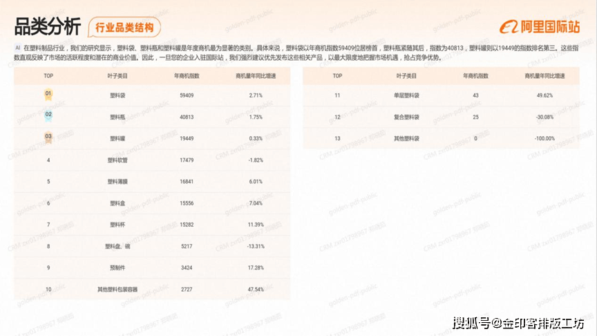 正在塑料成品行业,我们的研究显示,塑料袋、塑料瓶和塑料罐是年度商机最为显著的类别,具体来说,塑料袋以年商机指数59409位居榜首,塑料瓶紧随其后,指数为40813,塑科罐则以1949的指数排名第三,这些指数曲不雅反映了市场的活跃程度和潜正在的贸易价值,因而,一旦您的企业入驻国际坐,我们强烈优先发布这些相关产物,以最大限度地把握市场机缘,抢占合作劣势。